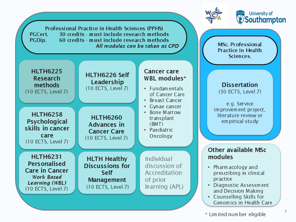 We have worked in partnership with University of Southampton through a HEE funded project to develop level 6/7 cancer education modules that sit within the MSc in Professional Practice in Health Sciences academic pathway.