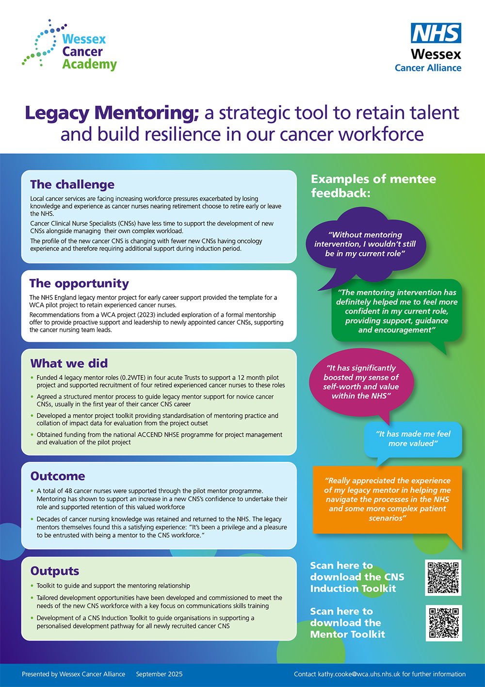 Wessex Cancer Alliance is piloting a 12-month Legacy Mentor Programme to strengthen and sustain the cancer nursing workforce. This initiative responds to national and regional challenges, including the early retirement of experienced cancer nurses, the evolving profile of newly appointed Cancer Clinical Nurse Specialists (CNSs), and recommendations from previous Wessex Cancer Alliance reports. It builds on learning from the national Legacy Mentor Programme and aligns with the ACCEND framework.