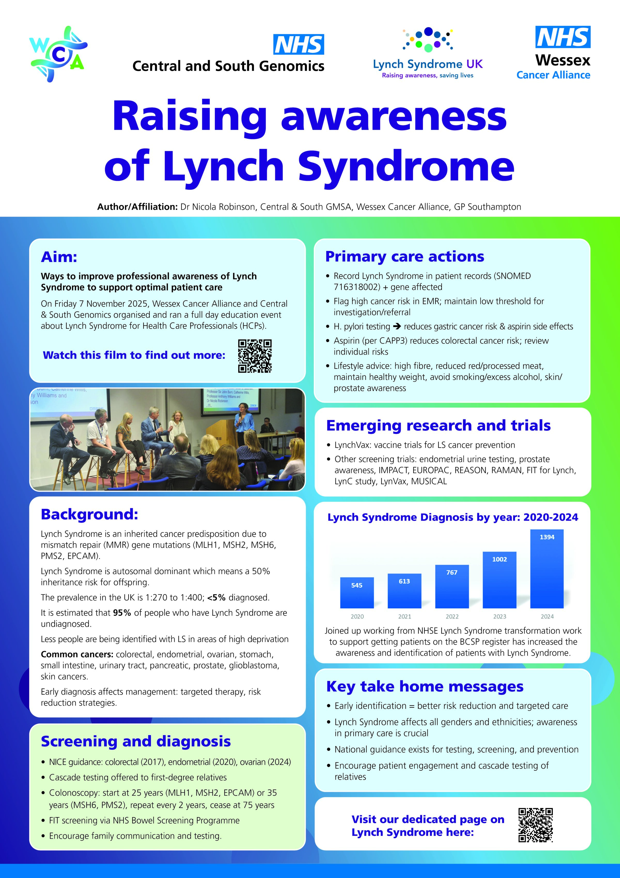 Following this one of our Lead Cancer GP’s Dr Nicola Robinson, represented Wessex Cancer Alliance at the first FIT for Bowel Services meeting held in Nottingham, where she shared the poster below to help raise awareness about Lynch syndrome and highlight work being undertaken in Wessex.