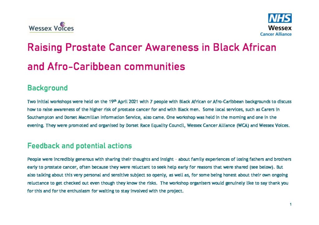 Wessex Cancer Alliance, with support from Dorset Race Equality Council and Wessex Voices, are working together with a group of Black men, their partners and other organisations to make sure men are aware of this.  We are listening to what they tell us about accessing health services, what they know about prostate cancer, and how we can all make sure men have the right information to decide what they need to do if they have concerns.
